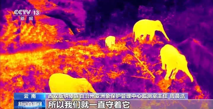西双版纳傣族自治州亚洲象保护管理中心监测室主任周晨浩:现在象是分散为两群,一群象已经下到路的右侧,有一群象仍然在公路上活动,它可能得吃饱了以后才会动,所以我们就一直守着它。